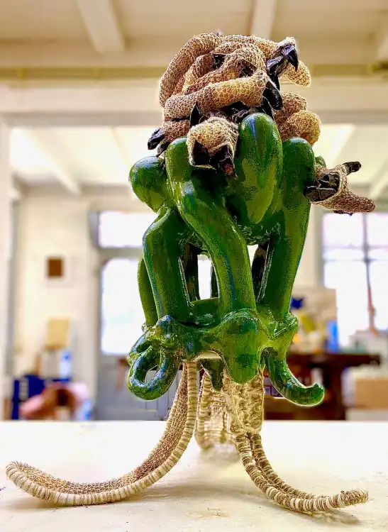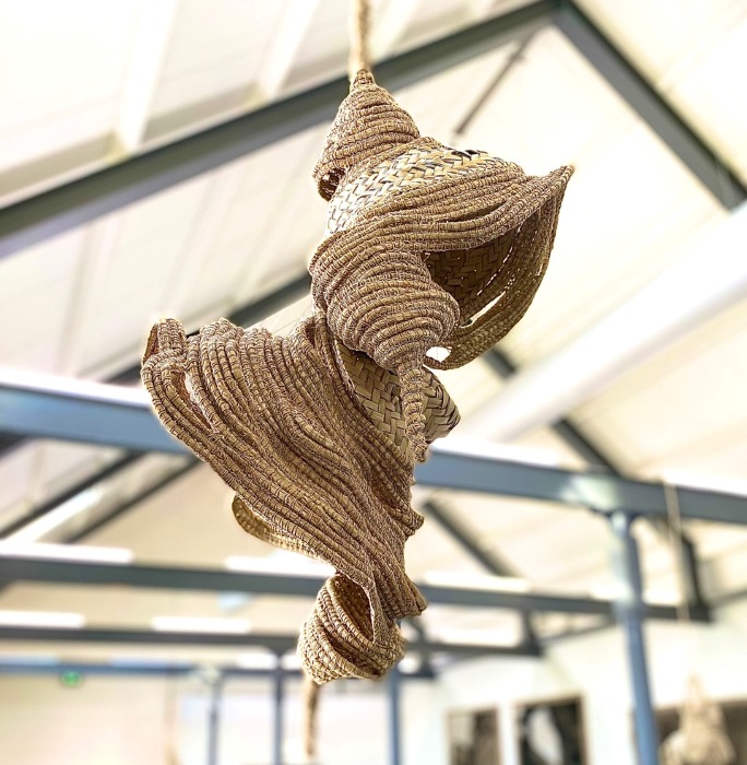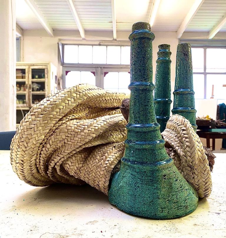 Objetos únicos que incluyen palma trenzada y combinación con objetos de cerámica.