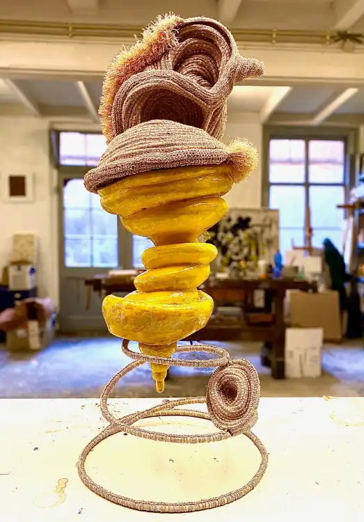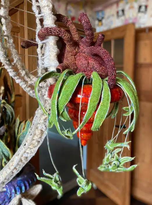 Con materiales vegetales: trenzado, tejido, hilado, crochet y macramé. Con arcilla: piezas únicas que fabrico y esmalto a mano.